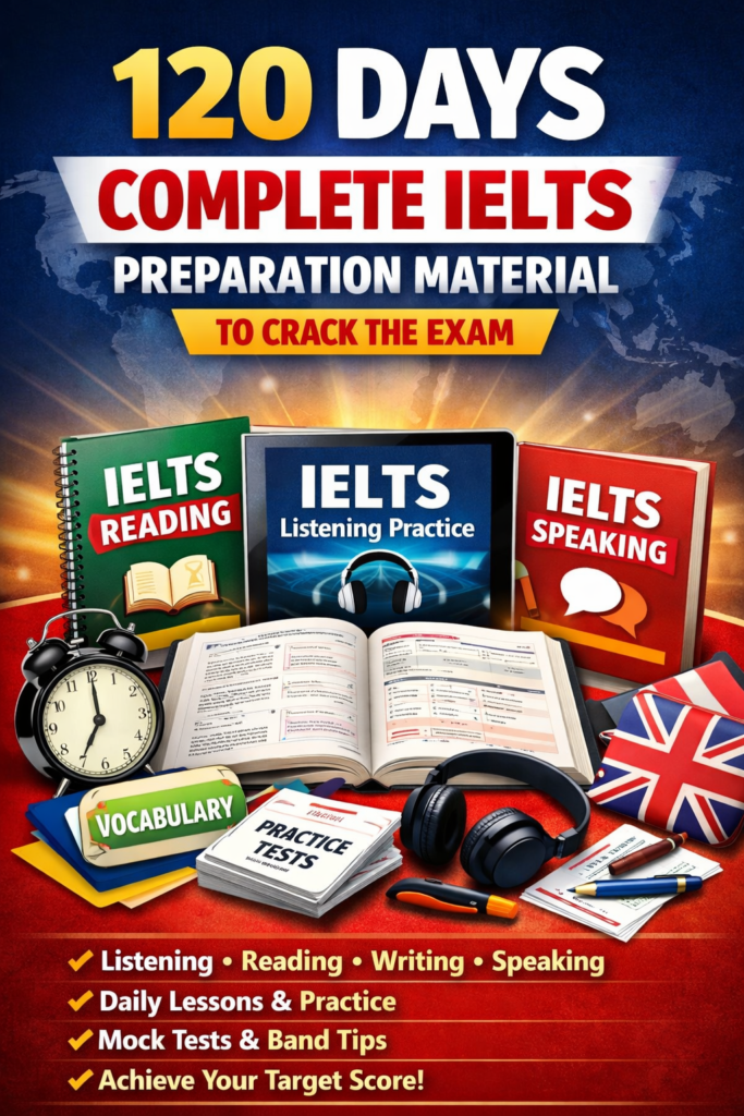 This package includes complete study material for Listening, Reading, Writing, and Speaking, along with a structured 120-day study plan.